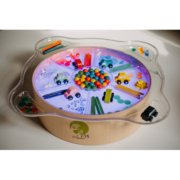 … Die verschiedenen Schalen mit sieben, elf oder dreizehn Unterteilungen bietet vielfältige Möglichkeiten zum Spielen und Lernen mit Sand, Perlen, Farben und anderem Sensorikmaterial auf dem Leuchtkübel (nicht inkl.). Die 7- und 13-fach Schalen haben außen einen Rand mit vier Vertiefungen als Ablage.