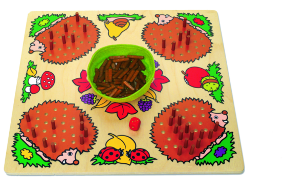 Herr Mecki und seine Freunde machen ihre Stachel nach dem Winterschlaf bereit. Die Spieler würfeln reihum um ihre Igel mit den Stacheln zu füllen. Je nach Augenzahl werden braune Stäbchen die Löcher gesteckt. Wer die Stacheln an seinem Igel als Erster gefüllt hat, gewinnt. Es kann mit einem 3er oder 6er Würfel gespielt werden.