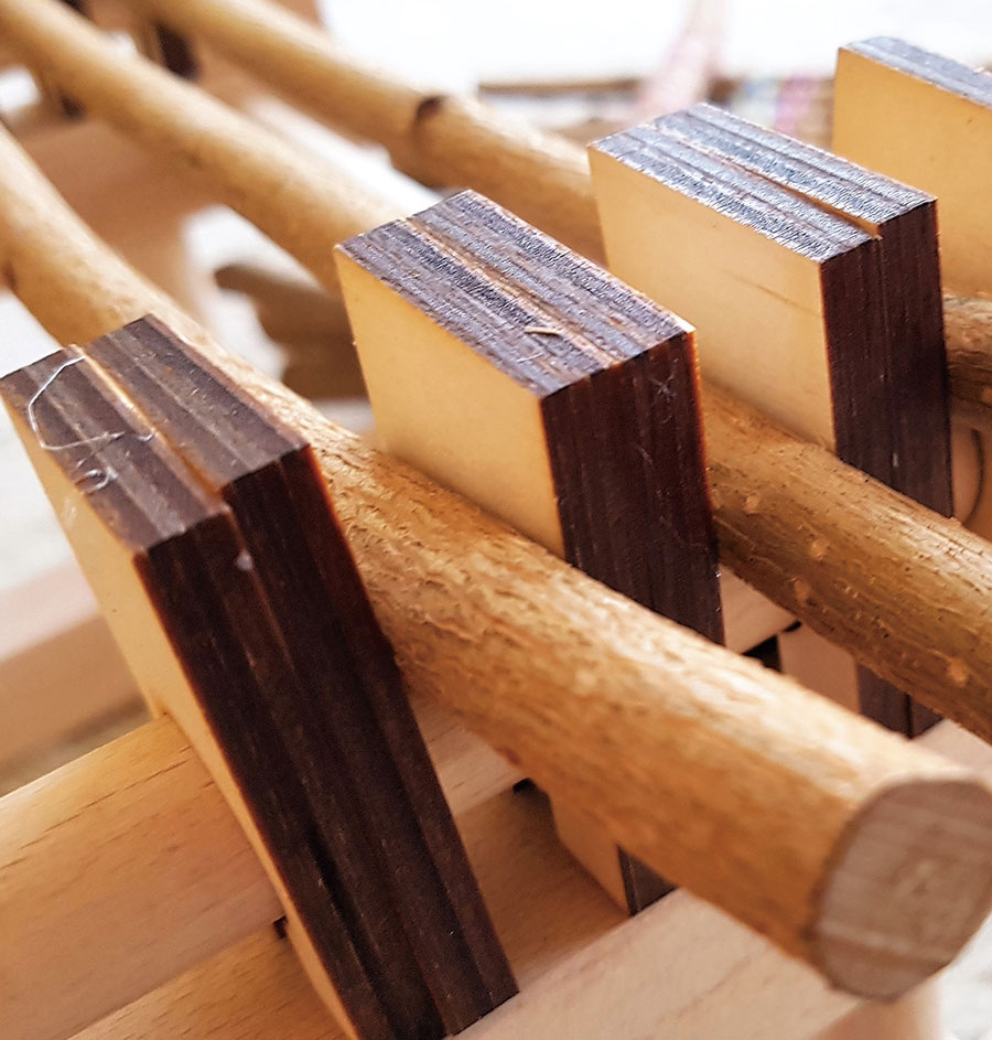 Man kann gesägte Leisten, gesammelte Stücke oder Schnittholz, das z. B. beim Sträucher verschneiden anfällt, in den Webrahmen einspannen. Besonders geeignet sind Haselnuss und Weide, da die Ruten relativ gerade wachsen.