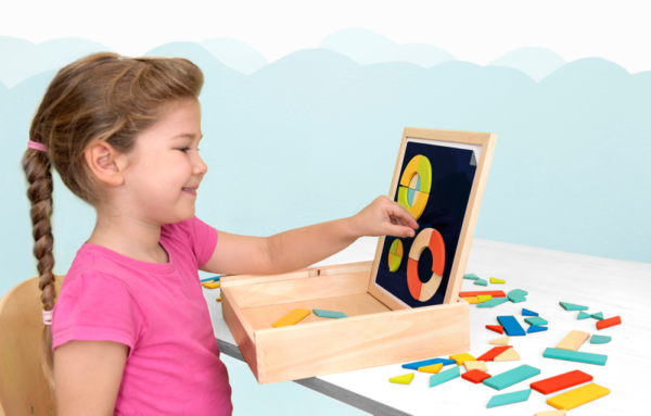 Die Kinder lernen ganz spielerisch geometrische Formen und deren Zusammenspiel kennen und schulen dabei Feinmotorik und Konzentrationsfähigkeit.