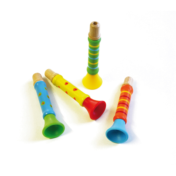Die kleine Trompete besticht im Design durch ihren Materialmix aus Kunststoff und Holz.