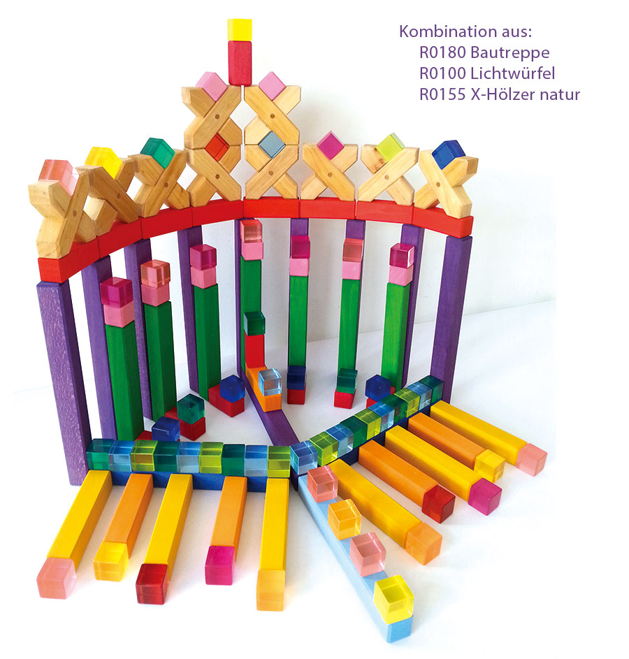 48 Teile, Erlenholz geölt und gedübelt. Maße: X-Klotz: 7 x 7 x 2,5 cm Kasten: 32 x 32 x 8 cm