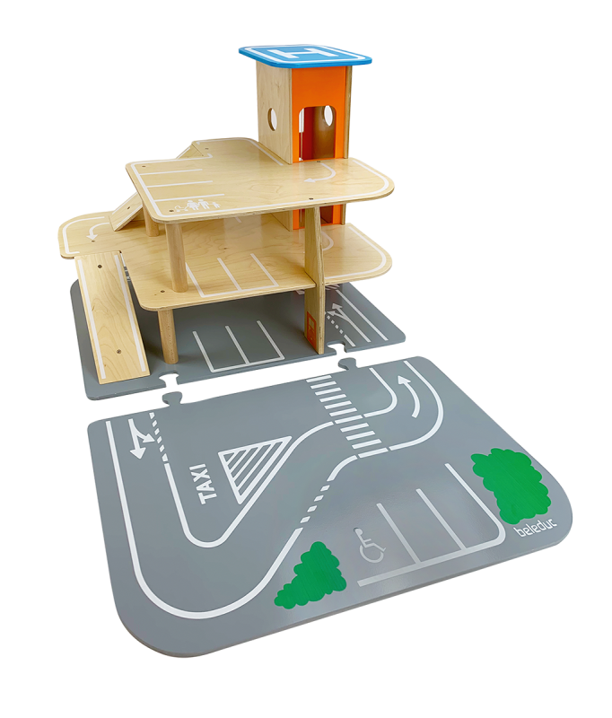 Auf drei Ebenen können Autos in der Garage geparkt werden oder die Rampen in einem Rutsch hinunterflitzen. Oder es geht über die Anfahrtsstraße direkt auf einen der eingezeichneten Parklätze. Der Fahrstuhl, der über einen Seilzug bedient wird, befördert die Fahrzeuge auf die verschiedenen Parkhausebenen. Der Helikopterlandeplatz auf dem Dach des Aufzuges macht den Spielspaß komplett. Die angehängte, vordere Spielebene erhöht den Spielmehrwert und den Aktionsradius der Spielautos.